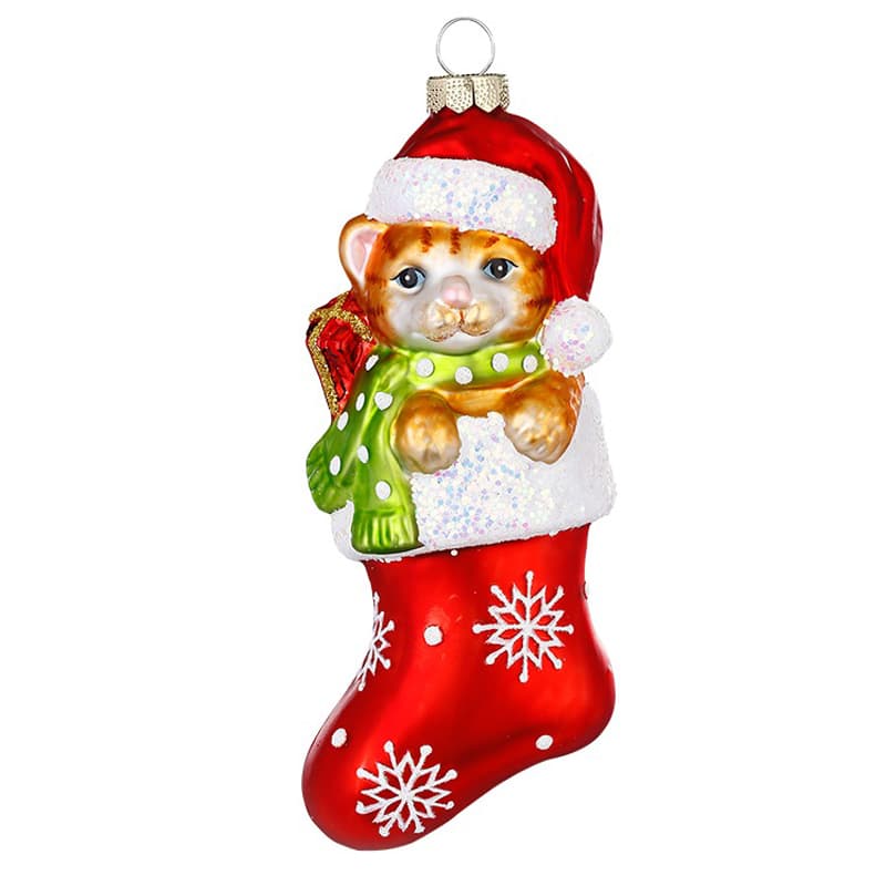 Glazen kerstbal - Bruine kat in sok