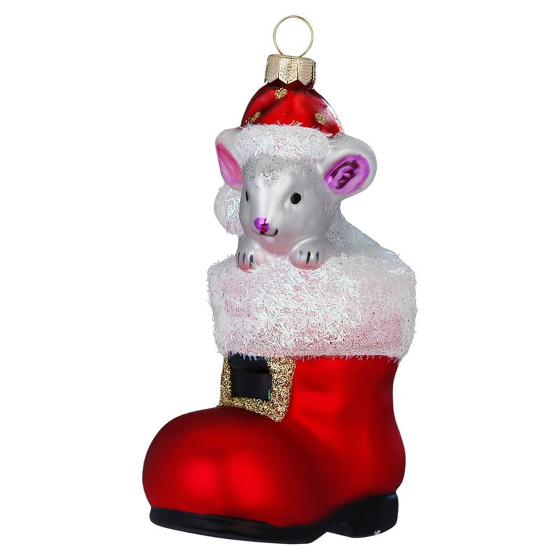 Kijk nou wat er uit de laars van de kerstman komt piepen! Het is een schattige muis met een kerstmuts op! Dat is toch een prachtig klassiek plaatje voor in je kerstboom!