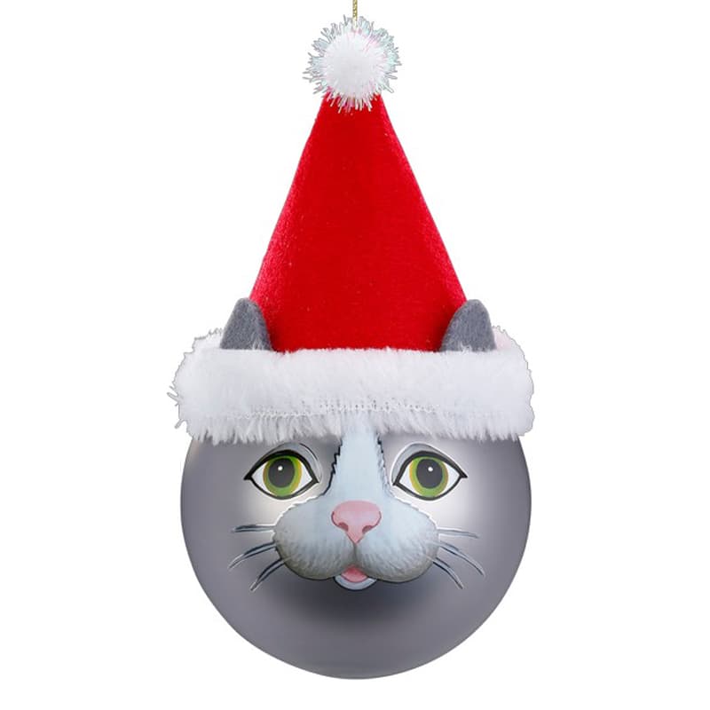Deze leuke grijze kat is één van onze huisdieren met kerstmuts, een schattige aanwinst voor in de boom!