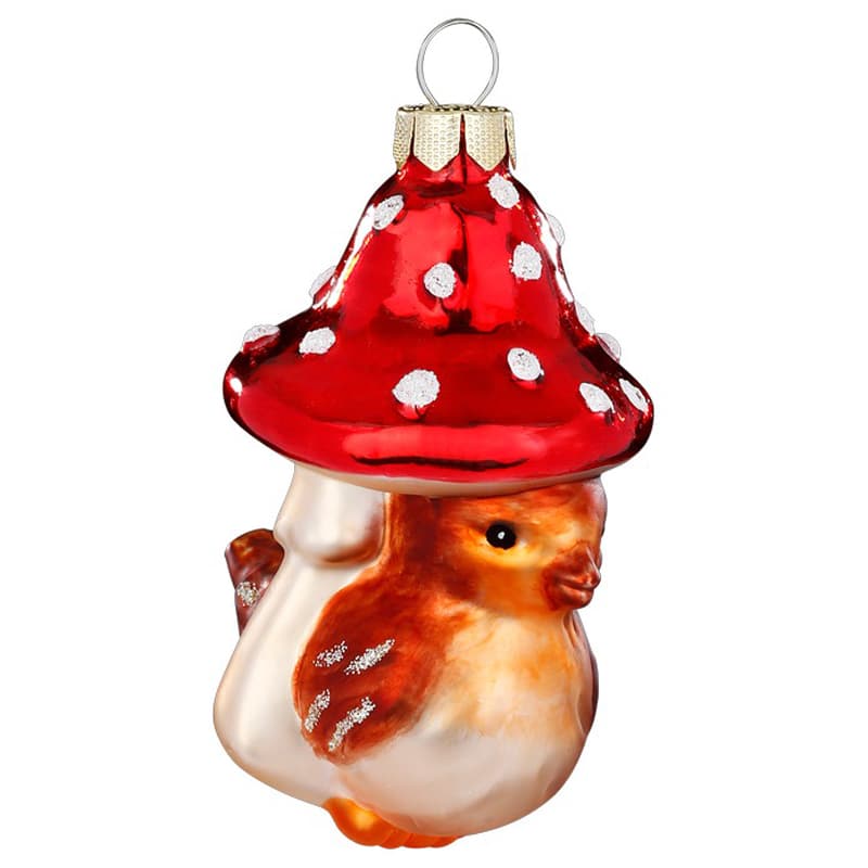 Glazen Kerstbal - Roodborstje onder paddenstoel
