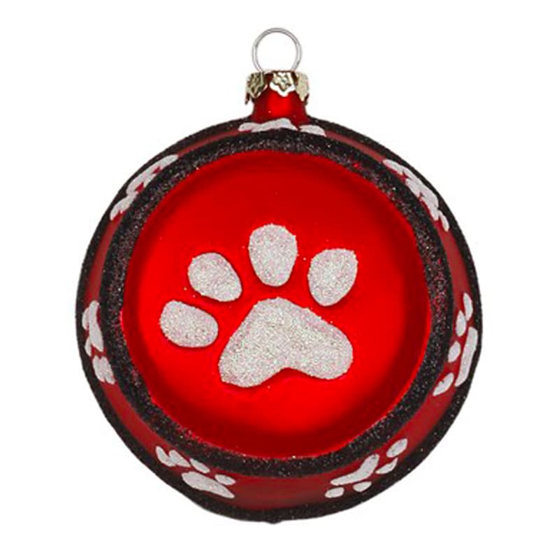 We hebben een serie van drie rode hondenattributen; een hondenbot, een pootafdruk en een voorboek. Zie hier de voerbak!