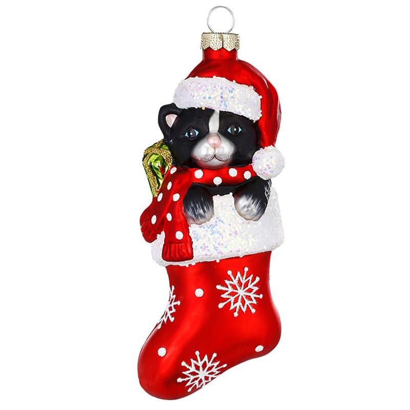 Glazen kerstbal - Zwarte kat in sok